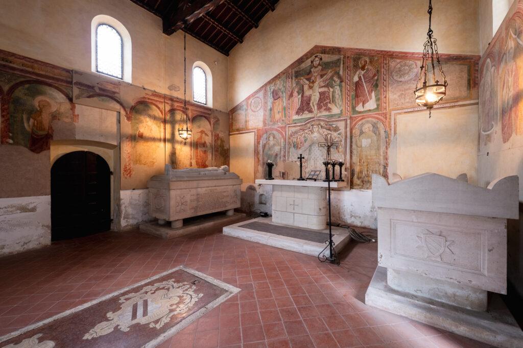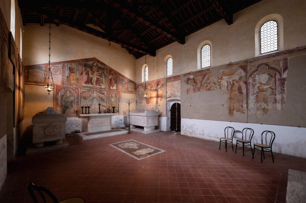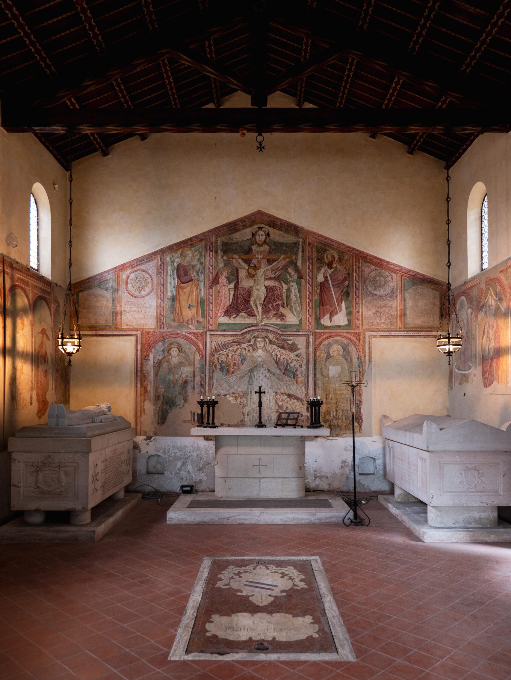 La Chiesa fu poi scelta come sede delle tombe della famiglia Ferretti, sotto il feudo della quale sorgeva l’edificio. Vi si conservano importanti affreschi, risalenti al 1450-55, che furono probabilmente coperti nel 1610, durante dei restauri compiuti dalla famiglia Ferretti, di cui resta testimonianza in un’epigrafe, e scoperti nel Novecento, in occasione dei lavori di restauro commissionati dai Ferretti; questi furono restaurati nel 1938-40 da Dante De Carolis e Marco Pesarini. Alcuni furono distaccati e poi ricollocati nel 1969.