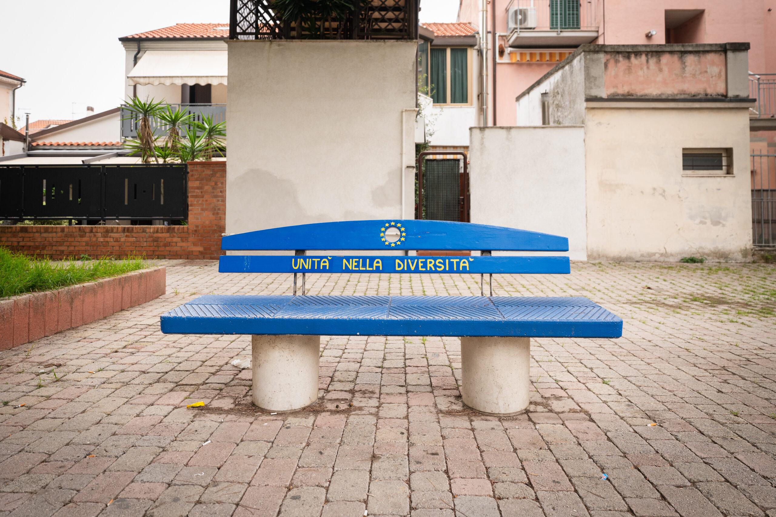 La piazza ospita la panchina “Unità nella Diversità”, inaugurata nel 2019 grazie all’iniziativa del Movimento Federalista Europeo.
